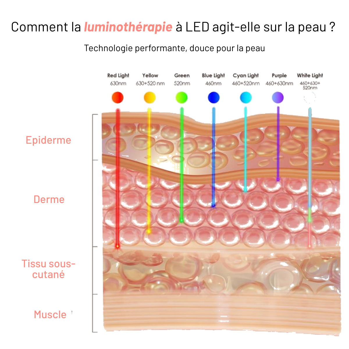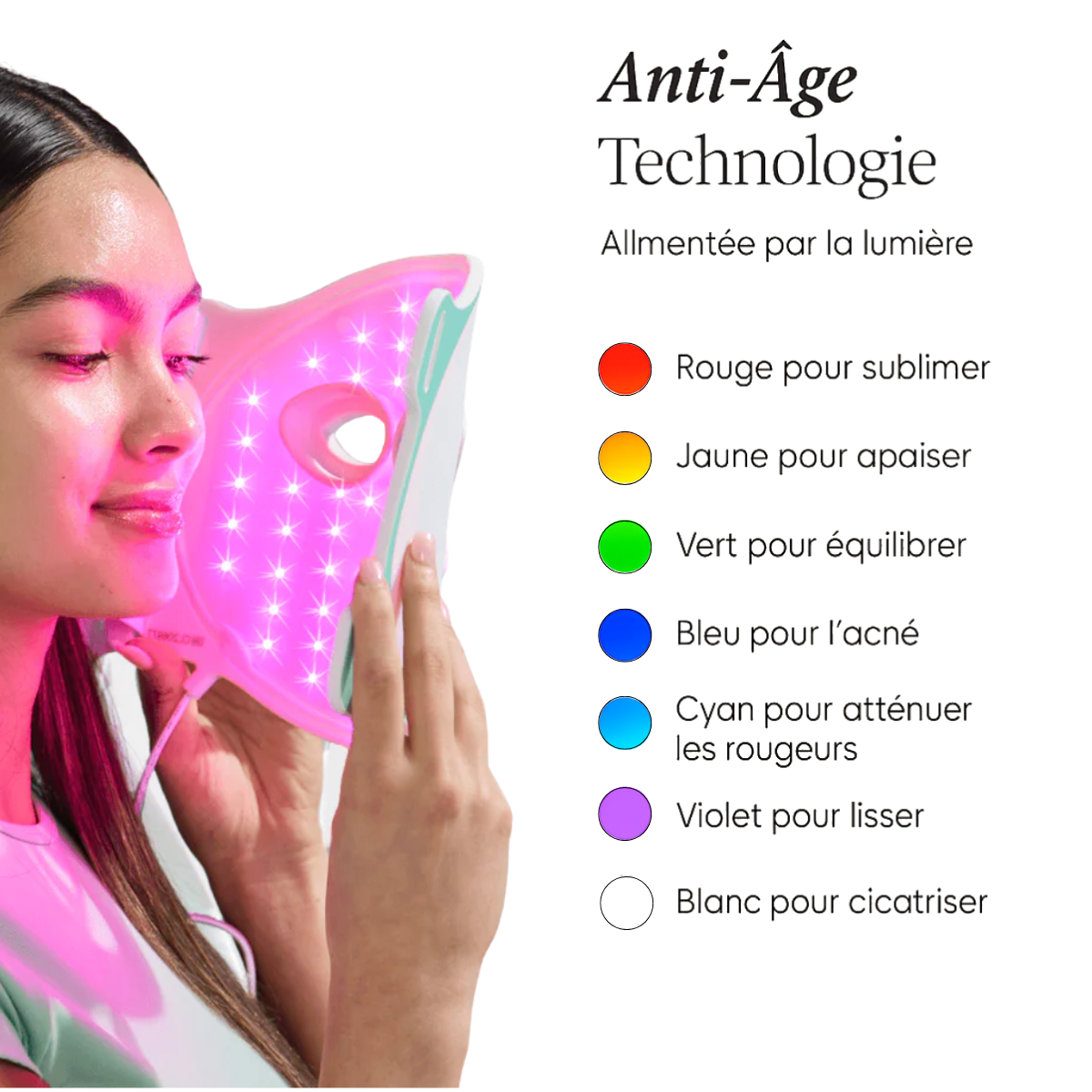 LuxLumi™ combine 7 LED de soin rouge, jaune, vert, bleu, cyan, violet et blanc qui résolvent chacune un besoin précis, pour agir là où votre peau en a besoin : stimuler le collagène, lisser les ridules, purifier les imperfections et apaiser les rougeurs.