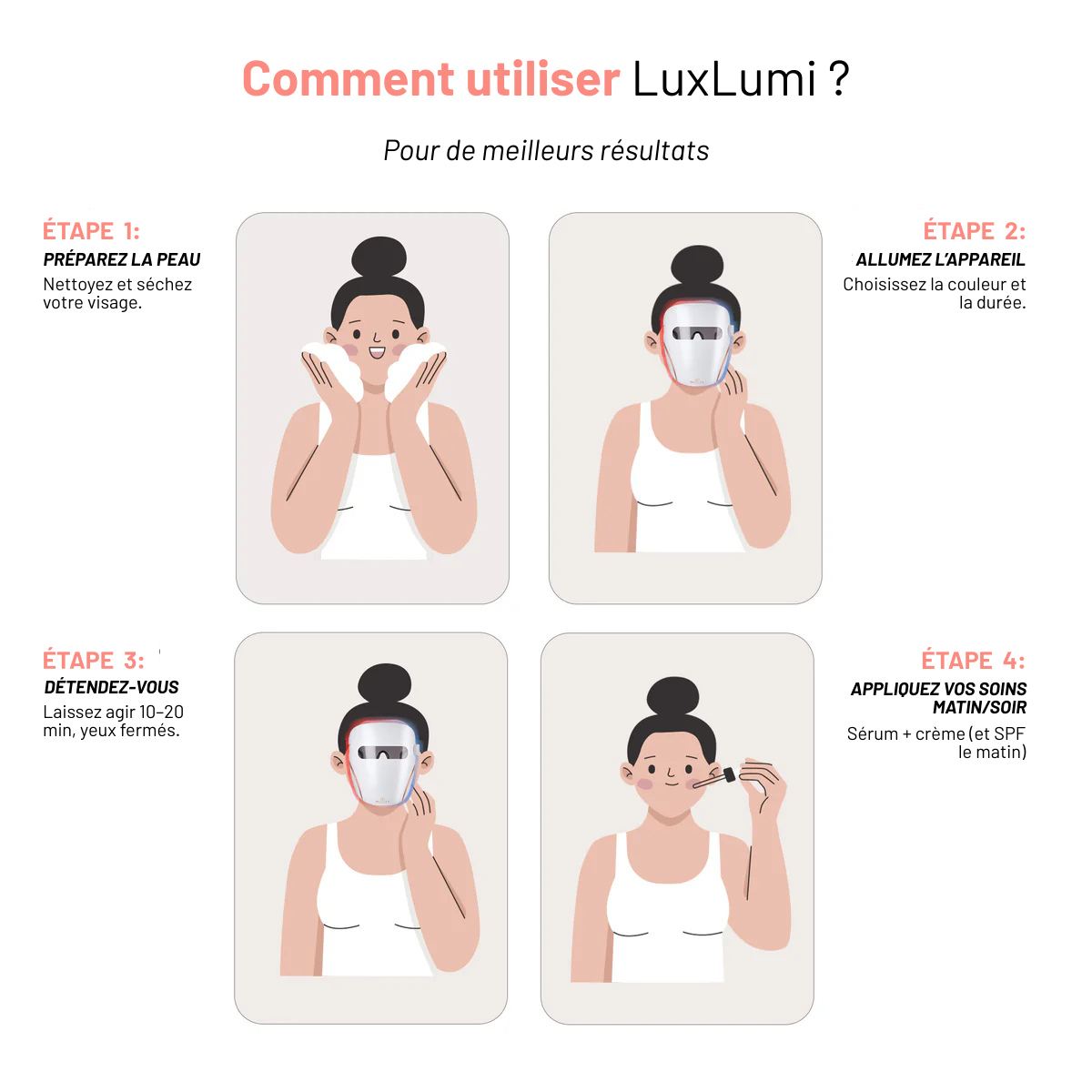 Rouge, jaune, vert, bleu, cyan, violet et blanc : choisissez la couleur adaptée à votre objectif — éclat, lissage, pureté, apaisement. En 10 minutes par jour, LuxLumi™ s’adapte à l’état réel de votre peau pour des résultats visibles, sans contrainte.